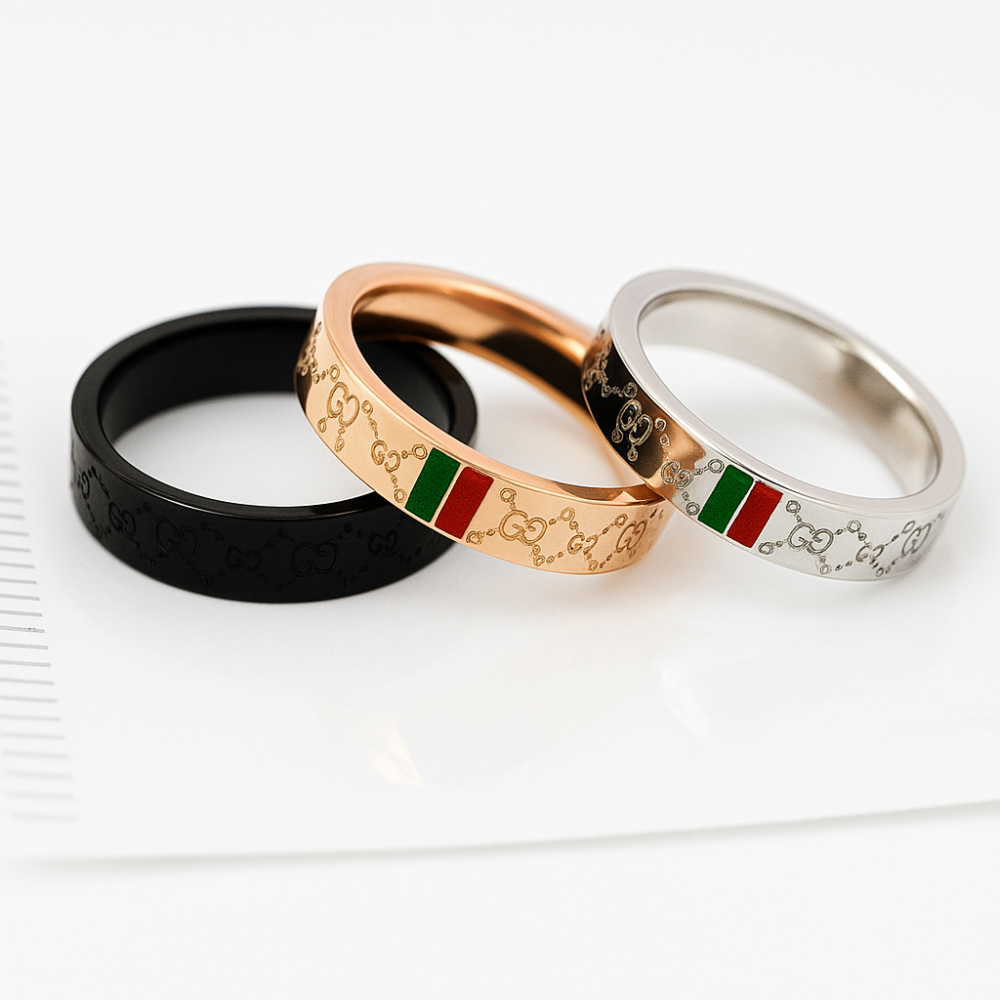 خاتم بلون الروز جولد (الذهبي الوردي): مزين بنقشة GG محفورة بعناية، ويحتوي على شريط مينا بتدرجات الأحمر والأخضر، المستوحى من ألوان علامة Gucci.